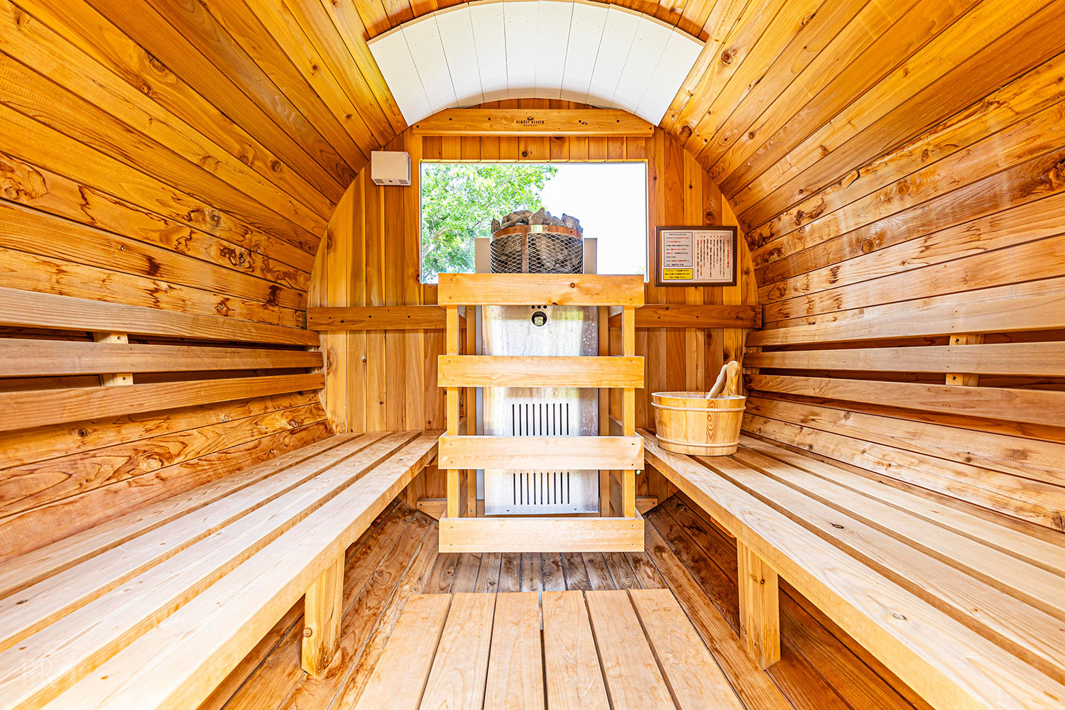 客室は各棟100㎡以上の完全プライベート空間に充実の専用設備を完備しております。各テントに隣接して雨天時や悪天候時でもBBQを楽しめる専用の食事スペース。24時間お好きなタイミングでご入浴いただける温泉風呂や専用トイレ、キッチンと水回りも充実。広々としたプライベートガーデンでは専用のサウナをご用意しており大自然の中、極上のととのうひとときをお過ごしください。