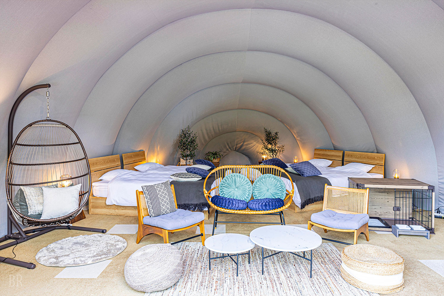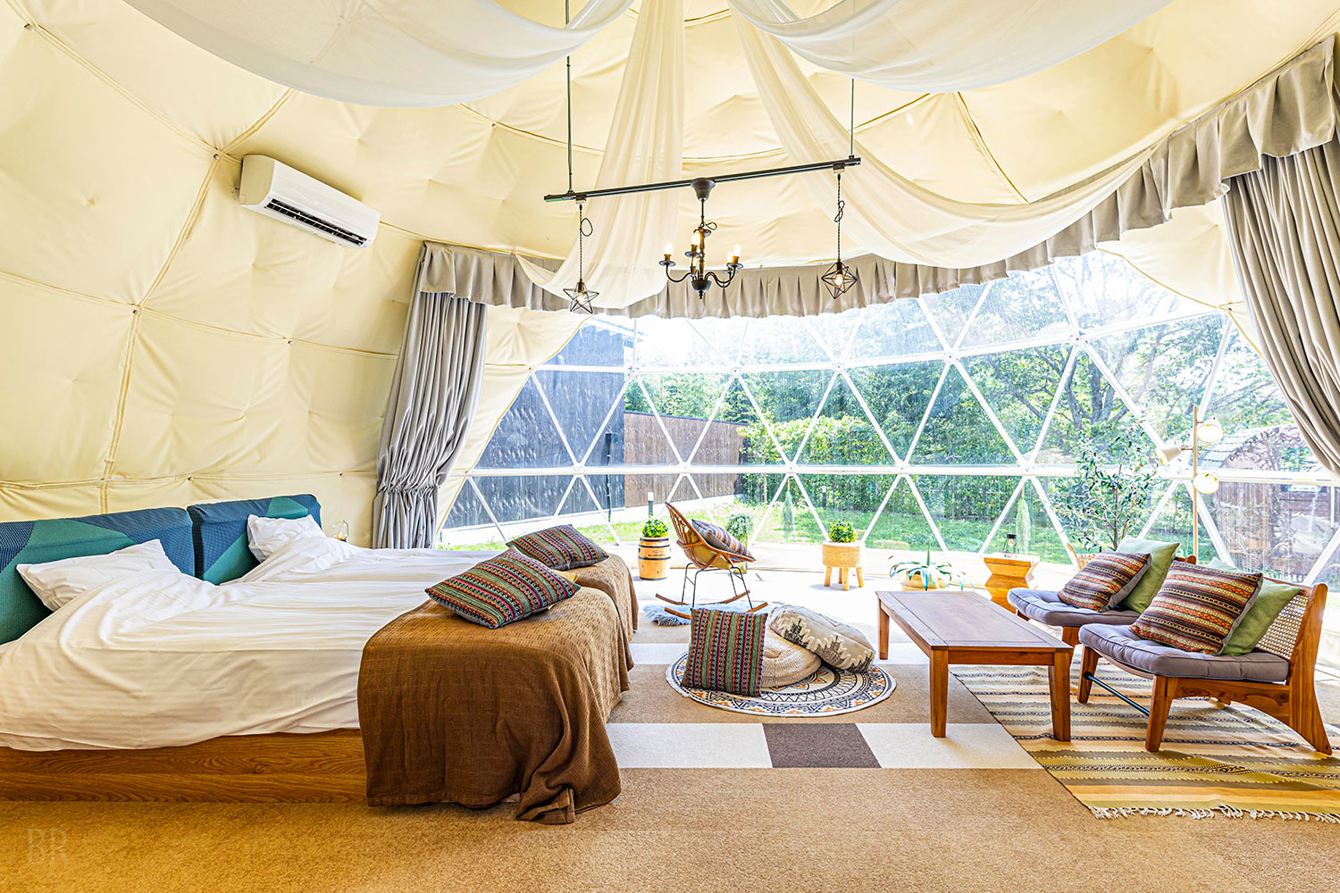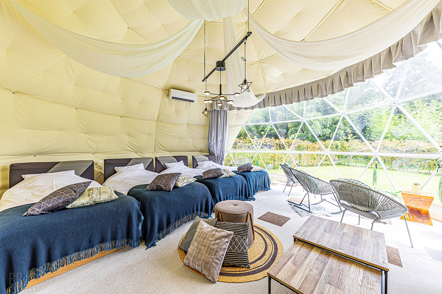 千葉県君津市初となる宿泊滞在可能なドームテントは直径6mの大空間が広がり、2重構造の室内はエアコンを完備。